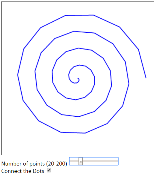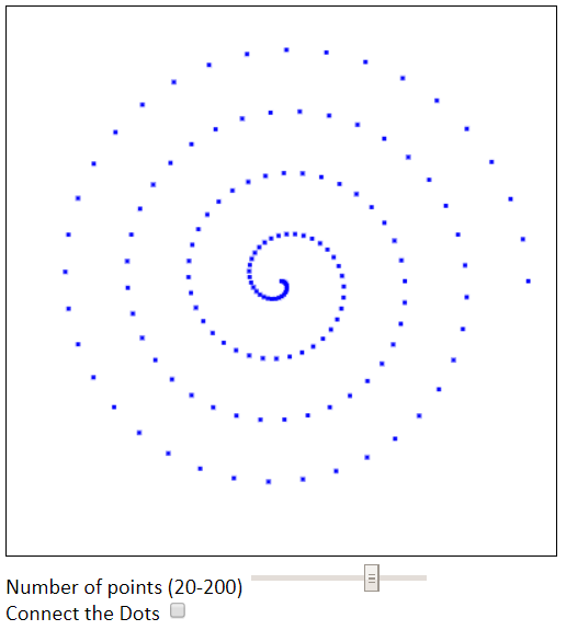 - Second, add a slider that controls the number of points that gets drawn. Make sure the slider has a range that goes from too few points (so you can see the spiral, but it looks jagged) to enough points that it looks smooth the whole way around.