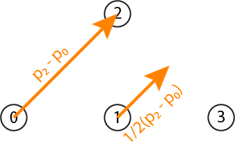 We will compute the derivative at a point (say ) by taking the vector between the previous point () and the next point () and scaling it by some value . To start with, we will simply make because this is the common value.