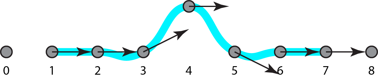 To interpolate a chain of points , , , etc., we will create a cubic segment between each neighboring pair. To specify the cubic, we will use the Hermite form: the cubic will interpolate its endpoints, and we will compute the derivatives based on the positions of the points. Importantly, we will use the neighboring points in this process so that we compute values that make the overall curve .