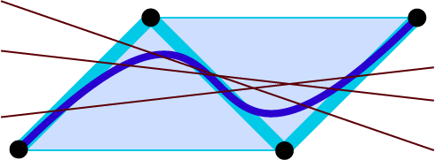 Notice that the “convex hull” shape is the light blue parallelogram - the dark blue curve stays inside of it. Also notice that any line we draw in the plane (I drew some dark red lines) can cross the polyline or the curve at most 3 (i.e., ) times.